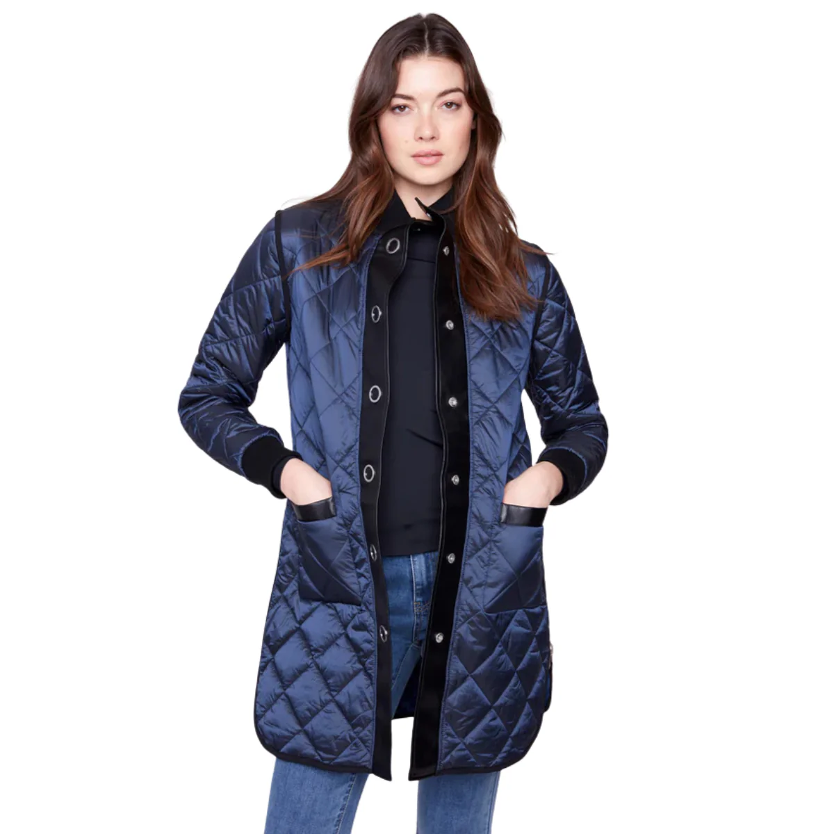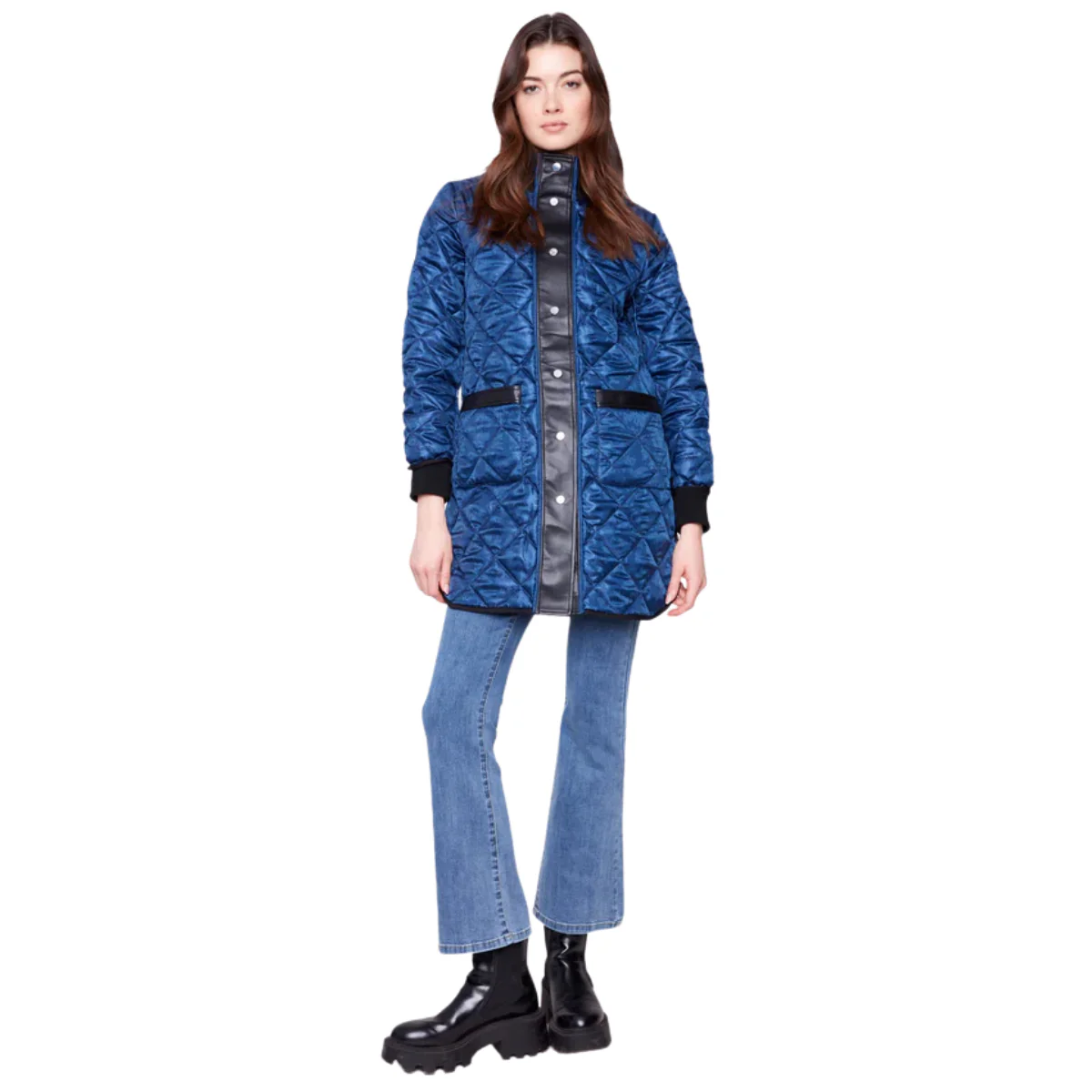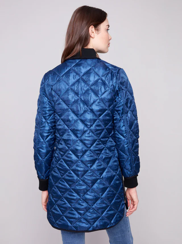 Rehaussez votre garde-robe d’automne avec ce manteau matelassé polyvalent bleu marine. Son design réversible chic offre deux styles en un : uni ou imprimé jacquard ton sur ton marine. Les poignets et le col en tricot côtelé apportent une touche de confort, tandis que la fermeture à boutons-pression assure un enfilage facile. Parfait pour rester au chaud lors des journées fraîches, ce manteau allie style et praticité avec élégance.